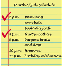 Yesterday I received an email from my sister detailing the events of our upcoming family get-together. Most of you don’t know me, but I am blessed with a large family who finds any reason we can to be together. So large, I guess, my sister felt the need to create this itinerary for our Fourth of July festivities.
